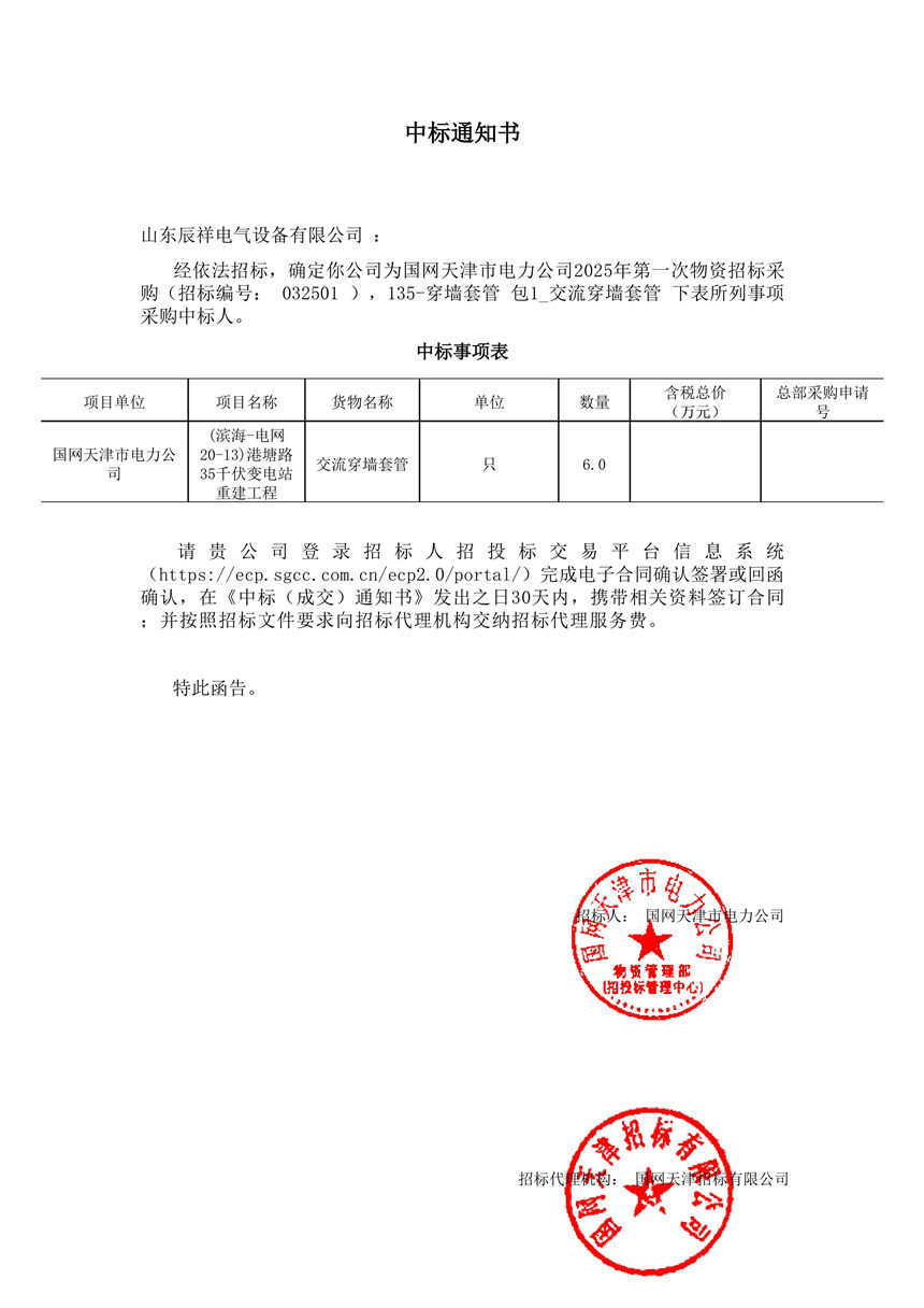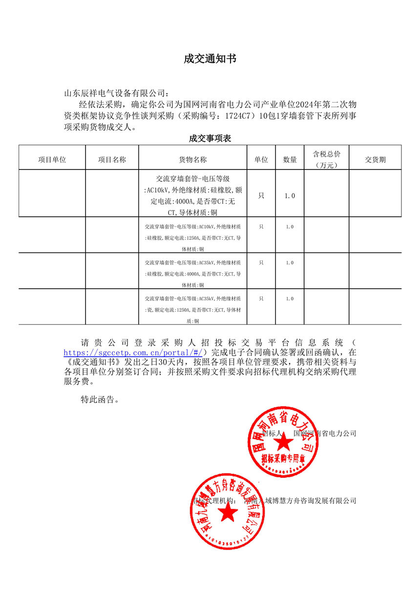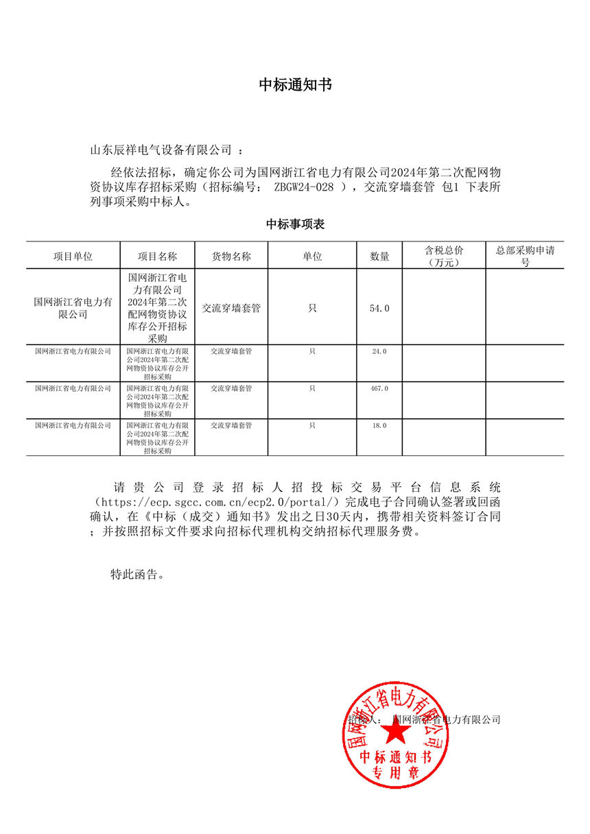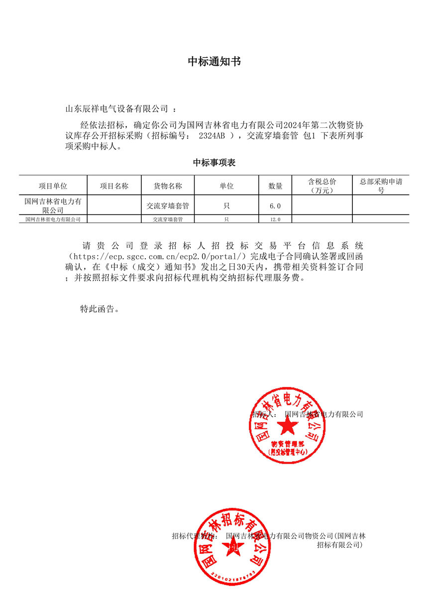 交流穿墻套管中標(biāo)通知書